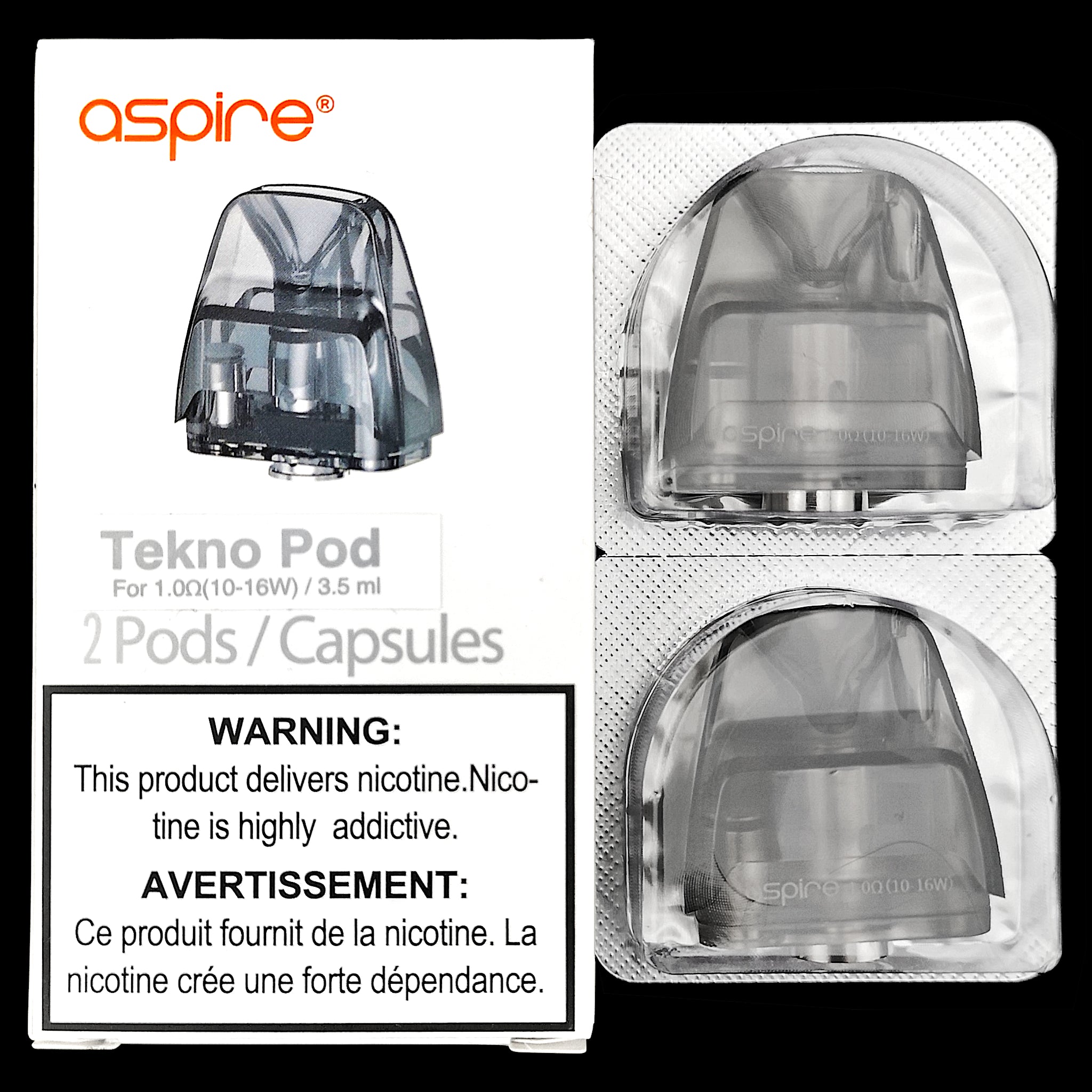 Replacement pods for the Aspire Tekno Pod Kit. These pods have a 1.0ohm resistance (10-16W) and can hold 3.5mLs of e-liquid. Each pack contains two pods.